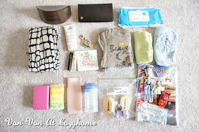 現在帶安德烈假日外出,主要都會帶到上圖那幾樣物品,這已經是精簡版了。美國天氣很不穩定,帶防曬乳的同時,還得帶長袖長褲衣物防寒,帶太陽眼鏡的同時,也還得帶條圍巾防寒。安德烈的零食袋、玩具、蠟筆、畫本都得幫他帶著以防不時之需。濕紙巾一定要大包的才夠用,相機、iphone、手機都是必要3C裝備。還有Von Von維護美貌的用品像口紅、護唇膏、護手霜跟鏡子。拉拉雜雜一大堆,所以包包容量不夠大,配置空間不夠精確,真的是很麻煩的!