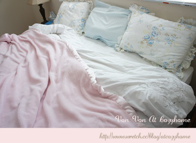 睡覺很幸福,如果能睡在舒服的床上更幸福!對於床的佈置,當然也是要用我的原則:『越凌亂越顯舒適溫暖才行。』我喜歡挑柔軟又高的上下彈簧床墊,床有彈性也支撐得住想依靠的身軀,我愛蓬鬆的枕頭,能把頭陷下去的那種,我會幫下床墊穿上蓬鬆的床裙像是穿上浪漫的芭蕾舞服,上床墊包裹著素雅的床單,配上簡單色調的純棉棉被,再多層觸感鬆軟的毯子,色調簡約柔和,純棉的被套皺皺沒關係,反而越皺越舒服,即使一起床沒摺被,隨手在床邊丟了幾件衣服,床還是給人好舒適柔閑的感覺如果有人碰巧見到妳的床,就知道妳剛剛睡了個甜密的好覺!