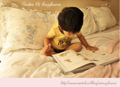 Andre 睡前翻書,他都是從第一頁快速翻到最後一頁, 再從最後一頁翻到第一頁,很不認真的唸法。