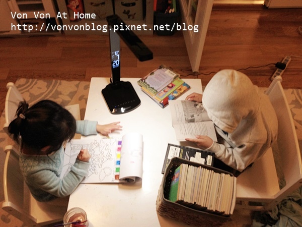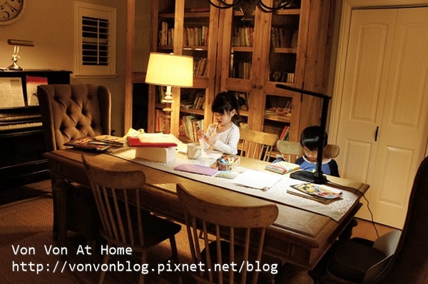 喜歡看他們這樣安安靜靜地在餐桌上看書、寫字、畫圖等爸爸回家吃飯的樣子。