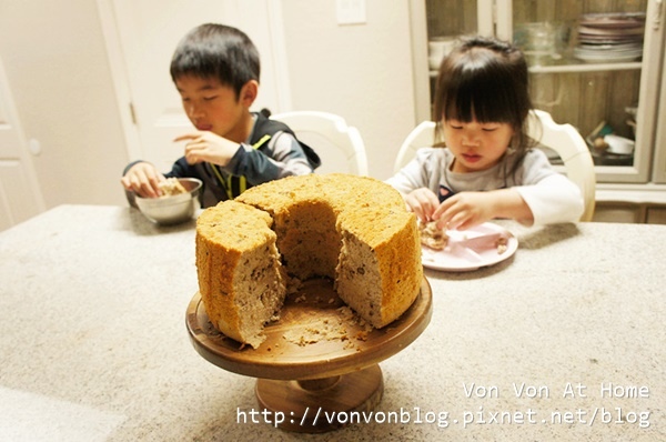 午後,按照MASA的食譜做了一個8吋的香蕉胡桃戚風,蛋糕還沒冷卻,孩子便聞香吵著要吃,我也跟著吃了一大塊,好軟綿濡口阿! 吃著吃著想到近來勤奮地上瑜珈及塑身減脂課,都因為這些甜食功虧一簣,要戒甜食真難 。