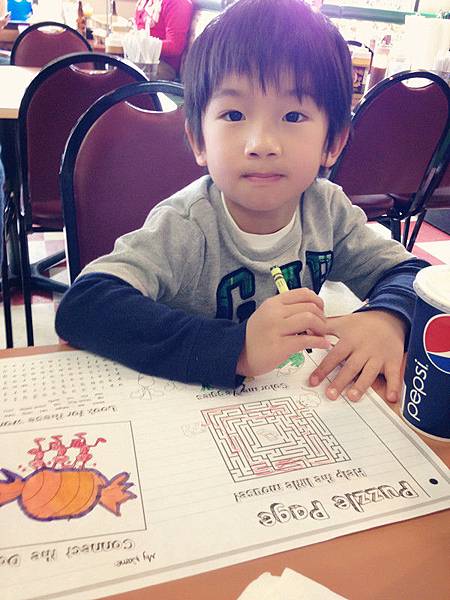 去餐廳如果有這種給小孩的遊戲紙,安德烈一定寫的超認真,好像要交功課一樣! 堅持寫完才能吃!
