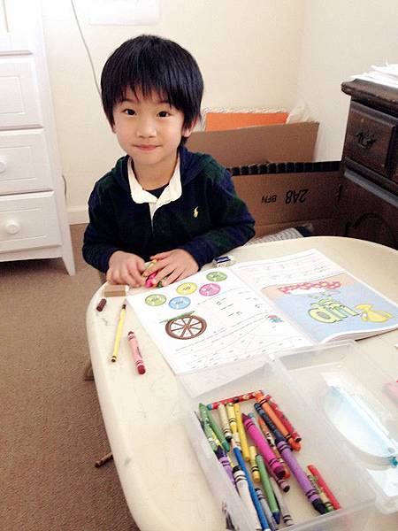 美國學校沒有回家功課,12點就放學,整個下午在家無所事事也不行,我都會給安德烈一些作業習題來練習,他會坐在我旁邊寫這些練習簿,他很喜歡在我旁邊做任何事,寫練習簿也行! 只要我陪著就好!