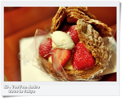 在欣賞過這些貴鬆鬆的糕點後,決定買一個超高檔進階版的馬卡洪MACARON,就是女服務生正幫我們拿的那個,一個直徑不到五公分比拳頭還小,三小口就可以解決掉,就要價日幣900多元(記得沒錯的話)。雖然我們只有買這麼一個小蛋糕,他們仍是把我們當貴賓看待,首先他們戴上白手套輕輕地幫我們從玻璃櫃裡拿起我們欲購買的蛋糕,幫我們用高檔的紙盒及紙袋包裝,外層再套上塑膠袋,我們付了錢後,女服務生還親自將小蛋糕拿到門口再拿給我們,我們離去時還深深地在門口給我們一鞠躬。這根本是我們在LV or 香奈兒才有的待遇,而我們不過只是買了一個小小的蛋糕。這種尊榮的服務,讓我們印象深刻。