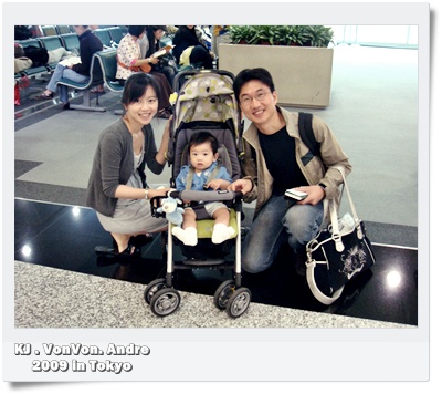 三個人的行李過濾後再過濾,最後終於全部擠在一個25吋的行李箱裡頭,KJ負責拖行李拿媽媽包,我推著上頭坐著安德烈的手推車,前往桃園機場,展開三個人的東京美食自助旅行。