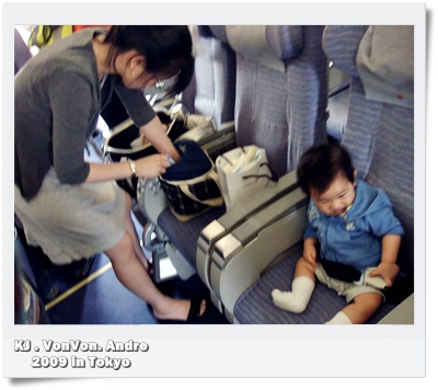 安德烈出生滿月時從美國回台灣的飛行旅途中,幾乎都在睡覺,乖的讓人嘖嘖稱奇,但是小時了了大未必佳,現在的安德烈,硬是不要大人抱著,他要自己坐,一下要咬遙控器一下要咬耳機,手不停要扳動餐板及安全帶扣,玩了沒多久就想睡覺,可是機上的掛籃對他來說已經有點太小了,頭跟腳都頂著,連個翻身都不行,他睡前"多爾滾"上身,他想滾,但飛機上就是沒地方讓他盡情滾。最後我跟KJ輪流抱著他在飛機上前前後後散步,最後在降落前20分鐘...他終於睡著了。