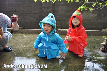 下大雨,孩子們拿著小雨傘、穿著雨衣、雨鞋,踏著小水漥來到附近大樹下躲雨,並齊聲高唱:『淅哩淅哩、嘩啦嘩啦,雨下來了,我的媽媽拿著雨傘來接我…』他們像是一群飛舞哼唱的小鳥們,嘰嘰喳喳,多麼可愛。