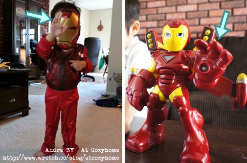 我叫安德烈比出 Iron Man 的姿勢,他老是做這個動作,把手舉出來比五,我很納悶這是什麼動作阿?? 我再叫他換個動作,他還是很堅持比五,我實在想不通........最後我終於知道他這個動作是從哪學來的了