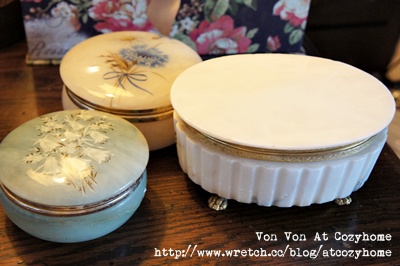 這些早期義大利製的大理石香粉盒我拿來放在梳妝台前當首飾盒 ,整個貴婦的FU都來了,縱使裡頭擺的是路邊攤買的手飾跟髮夾...。
