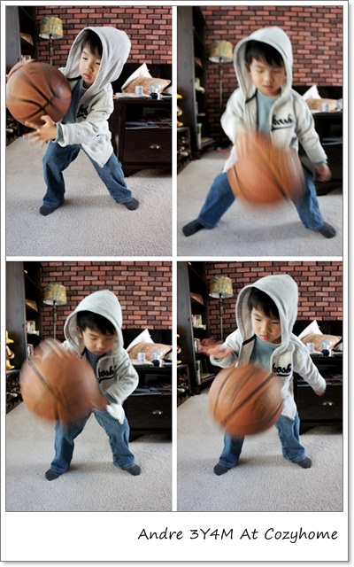 前陣子晚上我跟KJ常常看電視追蹤 Jeremy Lin 籃球比賽,沒想到安德烈也被影響了,這一兩個月,每天只要無聊就會拿起籃球開始練習運球,雖然是大人的球,他也拍得有模有樣,很有架式!所以我們家假日或晚上常常都會傳來安德烈運球的聲音,咚..咚..咚..咚..可以響個20幾分鐘不會停,他非常有毅力地挑戰自我的極限,練再久都不會累安德烈三歲,我目前還看不出他是個特別聰明的孩子但我喜歡看著安德烈對某些事情充滿著興趣及不放棄的旺盛力。