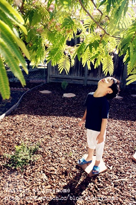 這是我們家前院的大樹,喝飽了水,曬足了陽光,枝葉群中佈滿了淡淡粉紅色的粉撲花,數百朵花朵每週以茂盛的姿態狂妄在翠綠中生長使得枝椏低垂,成了一片好大的樹蔭,每次只要一開前門,一股淡雅的自然清香會從花蜜間飄來,聞著心怡。
