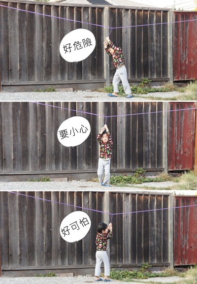 除了吵著看電視、吃飯吃太慢、不收玩具時我會罵他外,對於他在家不停的飛奔、跳躍、翻滾,我並沒有阻止他。這個年紀的孩子身上那源源不絕的活力及健康的體格正是上帝給他的最好禮物,不給他太多的限制,讓他沉沁在這樣的歡樂裡面! 他會長得很好的!( 安德烈把我家後院的曬衣繩當滑繩索,假裝猛拉著說好危險阿!