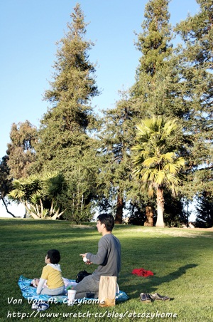 由於公園多人稀少,我們一家人往往都可以獨佔整片草地,冬天我們喜歡選有陽光撒落的綠蔭處,鋪著柔軟棉質的野餐墊,買點三明治或漢堡及帶些水果便可簡單用餐,草地乾淨地散發清香的芬多精味道,即使不鋪墊也可就地躺憩,我們會帶幾樣可以和孩子一同玩的玩具或球類運動,舒服悠哉地度過一個陽光煦煦的午后!灣區冬天的暖陽,舒服的像是迎面春風,讓人喜上眉梢阿!